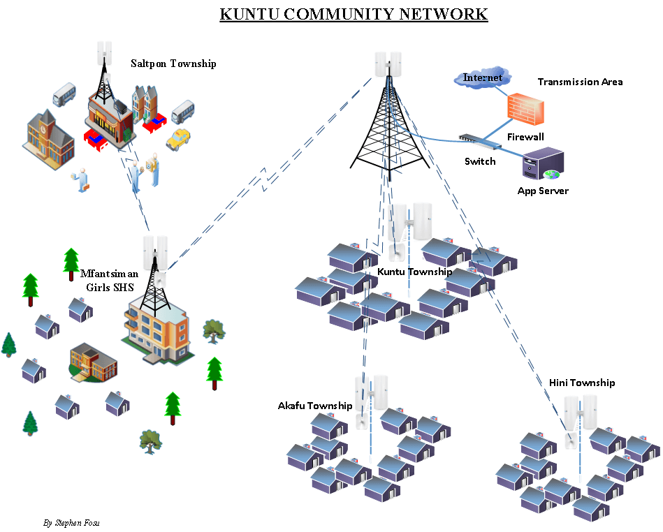 The Kuntu Community Network project is aimed at providing affordable and easy access to the internet in all parts of the Nkusukum traditional communities. It serves all the public, private and households with their digital needs. The project installed transmission devices in the community to provide wireless internet to members of the communities. It also promotes the use and appropriation of ICT in Nkusukum traditional communities by means of initiatives from the various actors in the communities i.e. the governmental sector, the civil society, and the private sector.