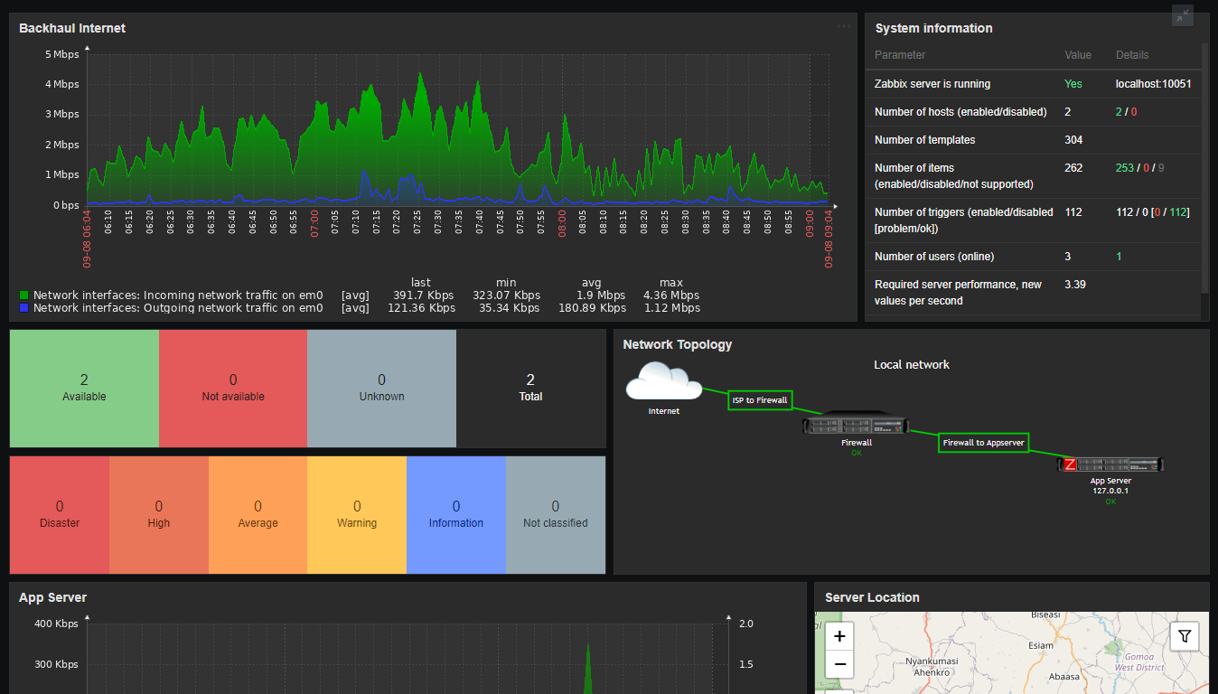 Zabbix is a graphing system, another open-source tool for graphing data over time. In this case, we graph various things for each host on the network to understand what is going on, and for troubleshooting purposes.