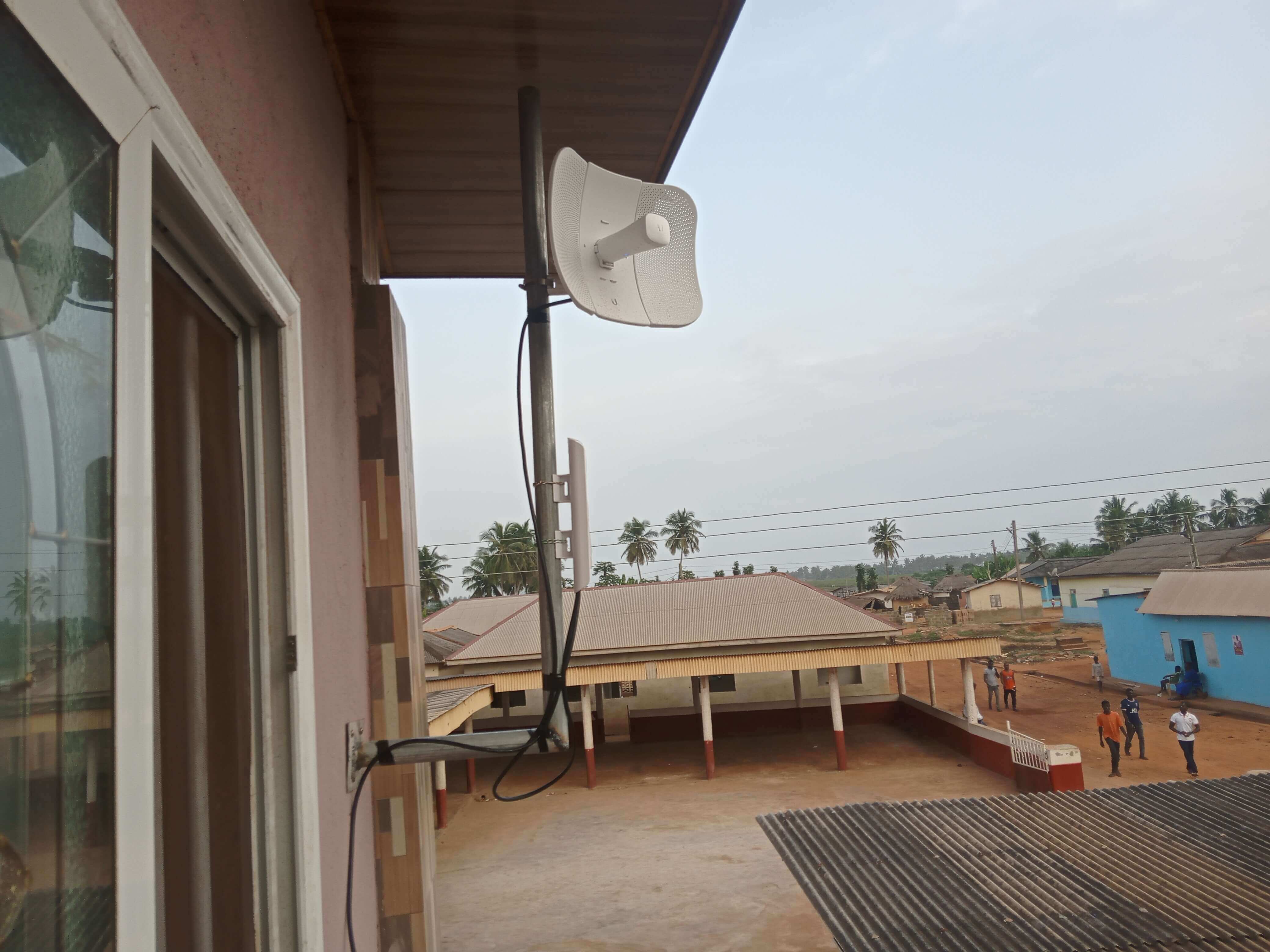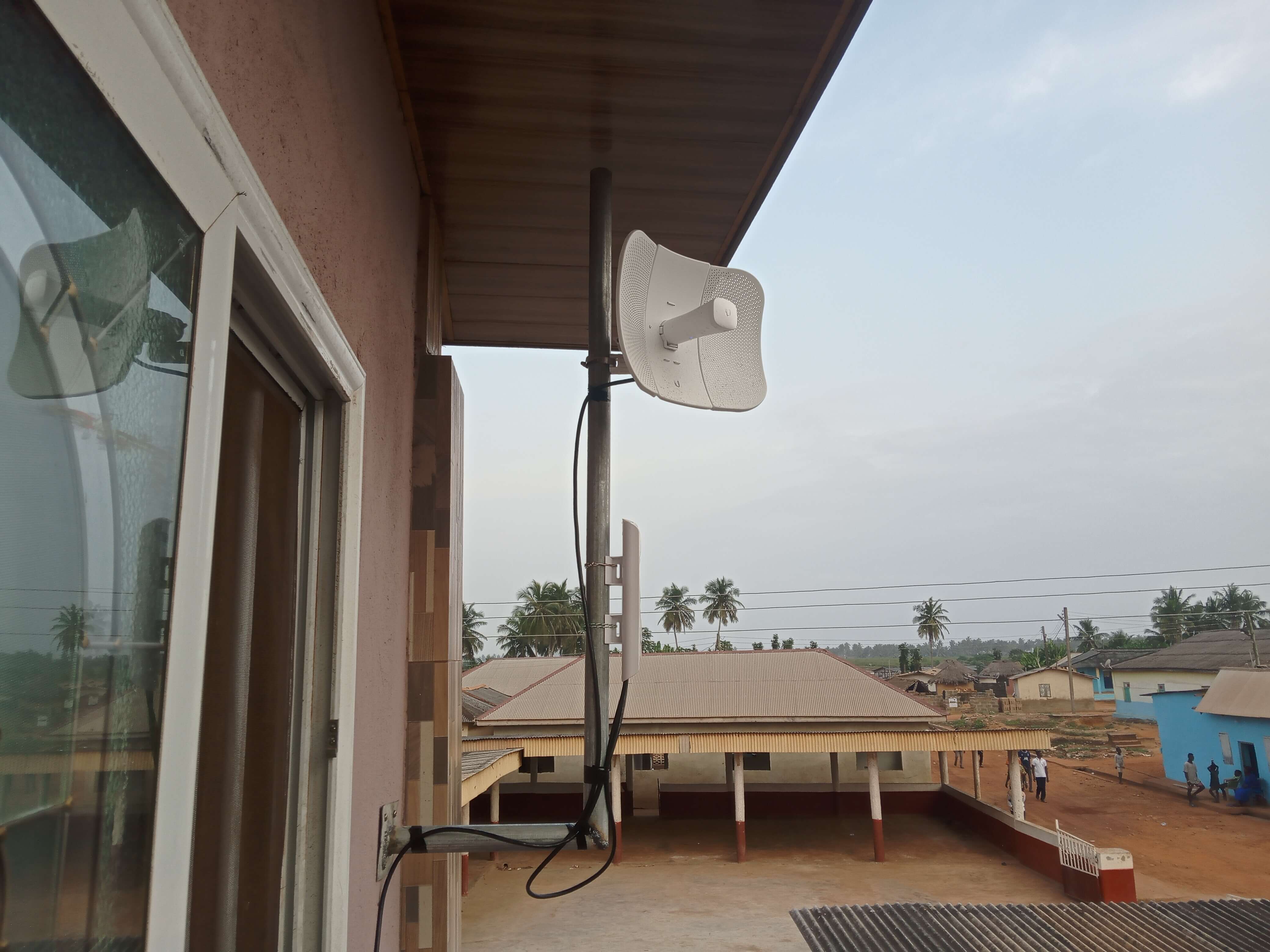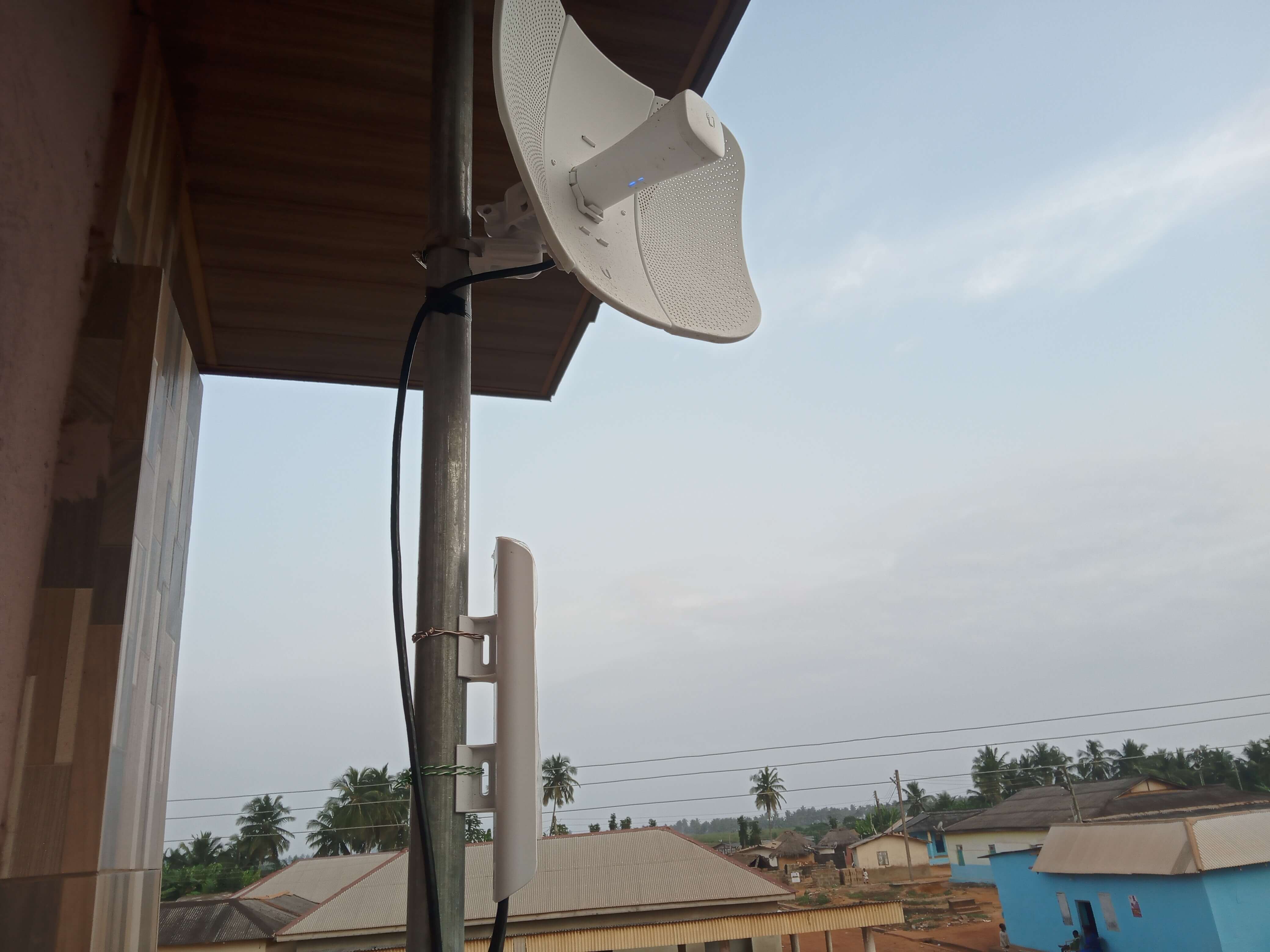 In Kuntu Township, we mounted pole with LiteBeam 5AC-Gen2 5GHz configured as Station mode at the Chief’s palace and link directly to the main transmission site through Point-To-Point means. From here an outdoor Cat6 patched cable goes to a passive PoE (Power of Ethernet) LAN port on NanaStation M2. The NanoStation which is also attached to the pole is configured as an Access Point to enable propagate the open wireless signal (internet) to the community or public. An outdoor Cat6 patched cable goes down from the NanoStattion to a PoE (Power of Ethernet) adaptor.