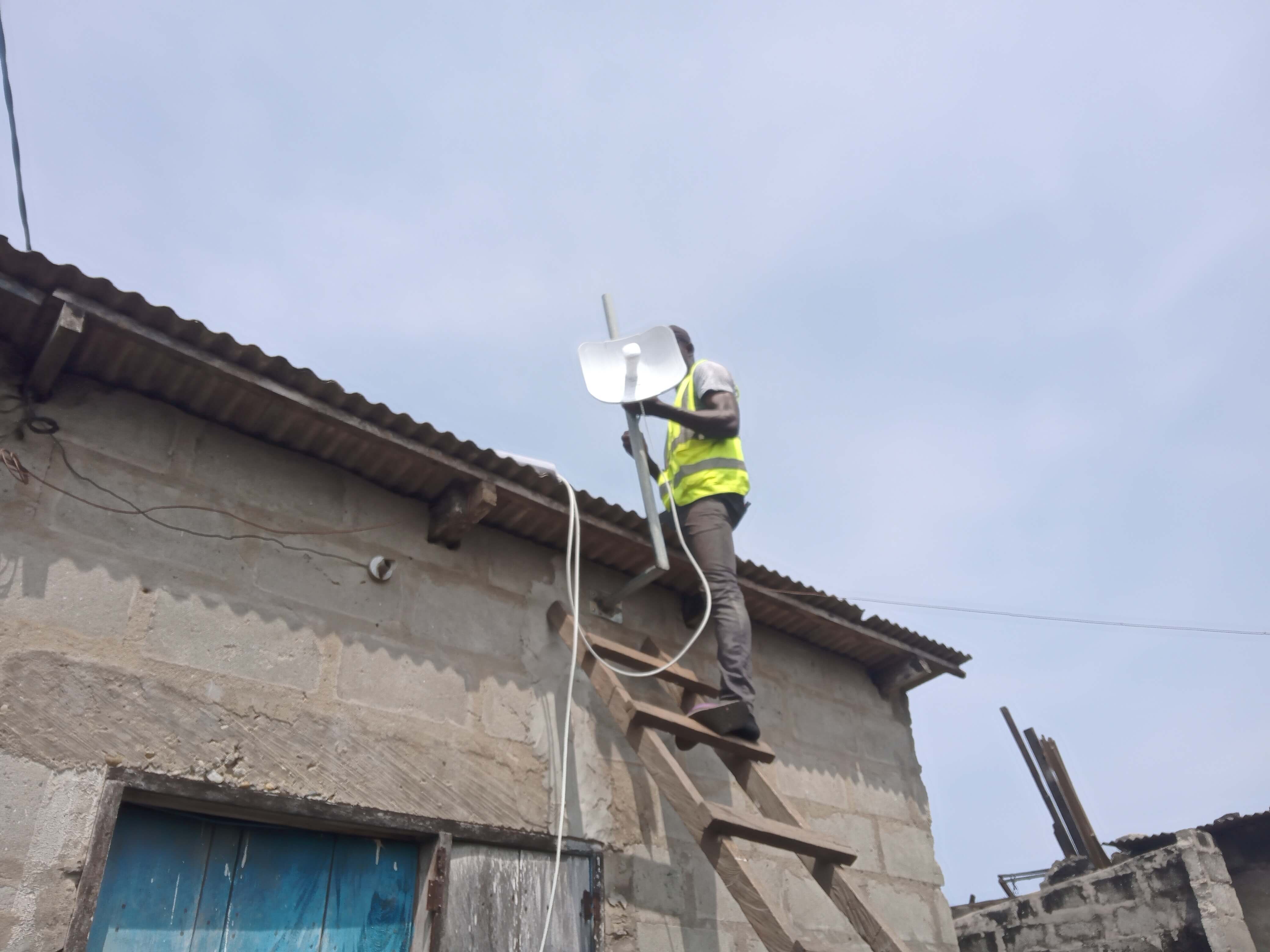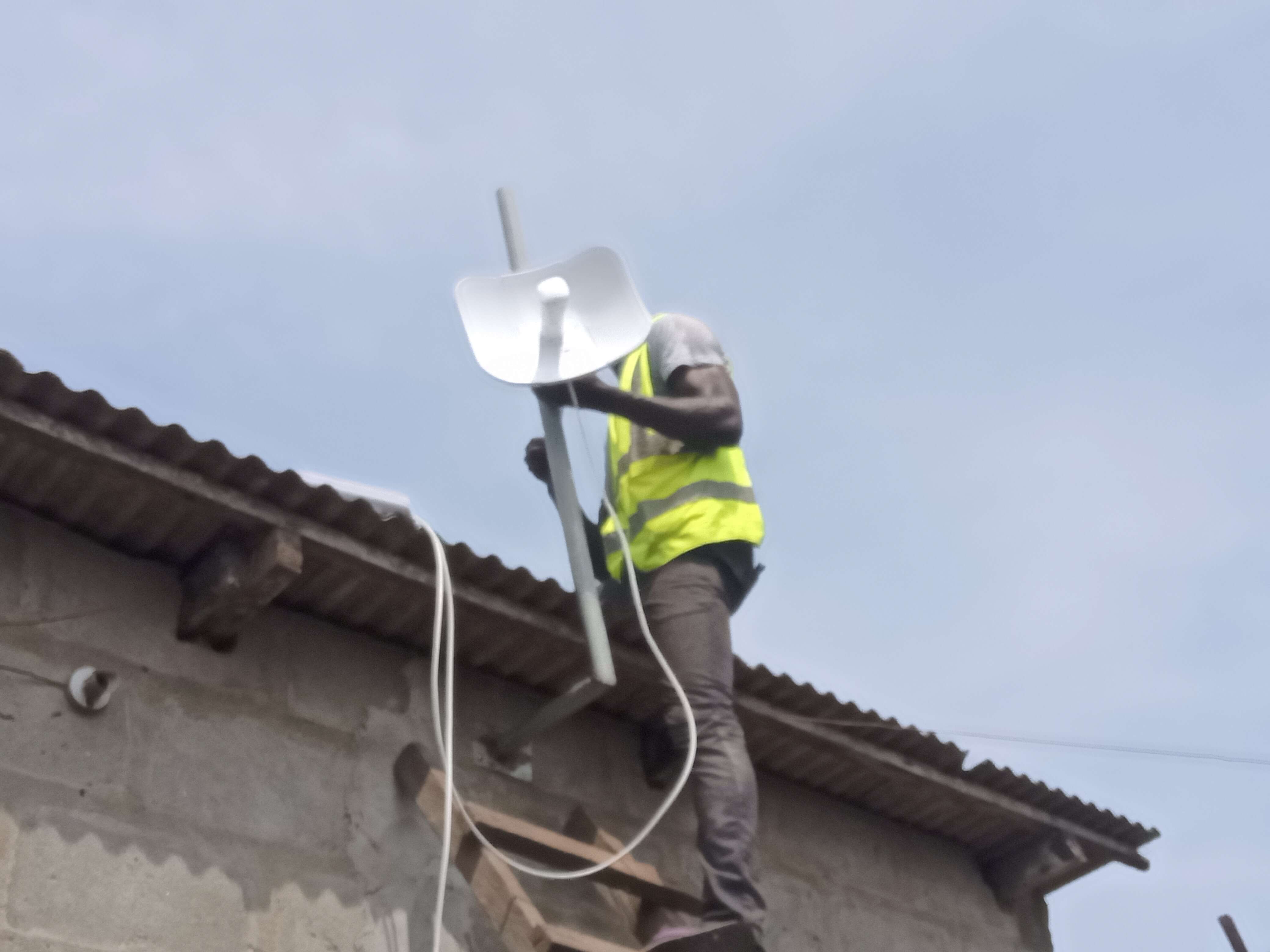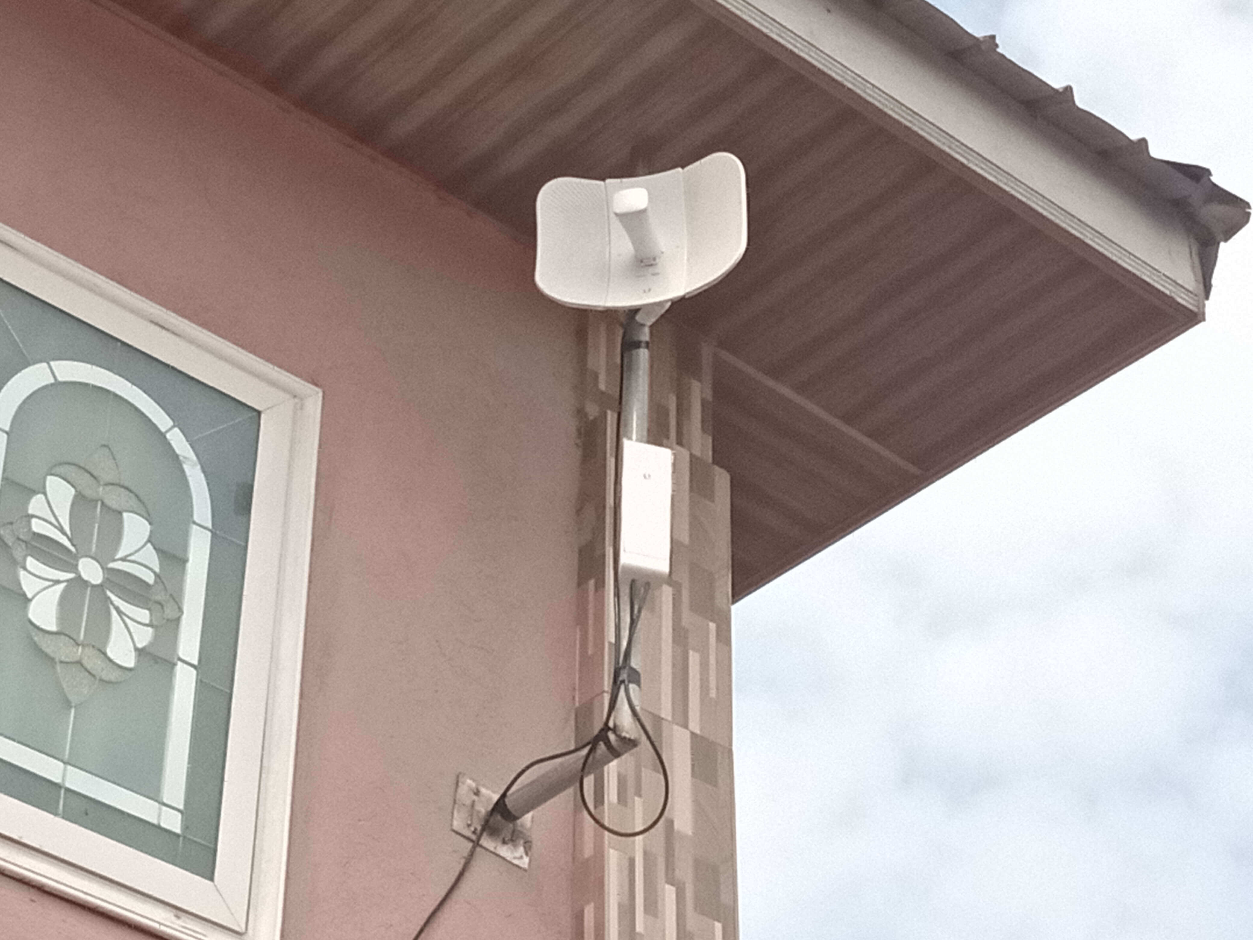In Kuntu Township, we mounted pole with LiteBeam 5AC-Gen2 5GHz configured as Station mode at the Chief’s palace and link directly to the main transmission site through Point-To-Point means. From here an outdoor Cat6 patched cable goes to a passive PoE (Power of Ethernet) LAN port on NanaStation M2. The NanoStation which is also attached to the pole is configured as an Access Point to enable propagate the open wireless signal (internet) to the community or public. An outdoor Cat6 patched cable goes down from the NanoStattion to a PoE (Power of Ethernet) adaptor.