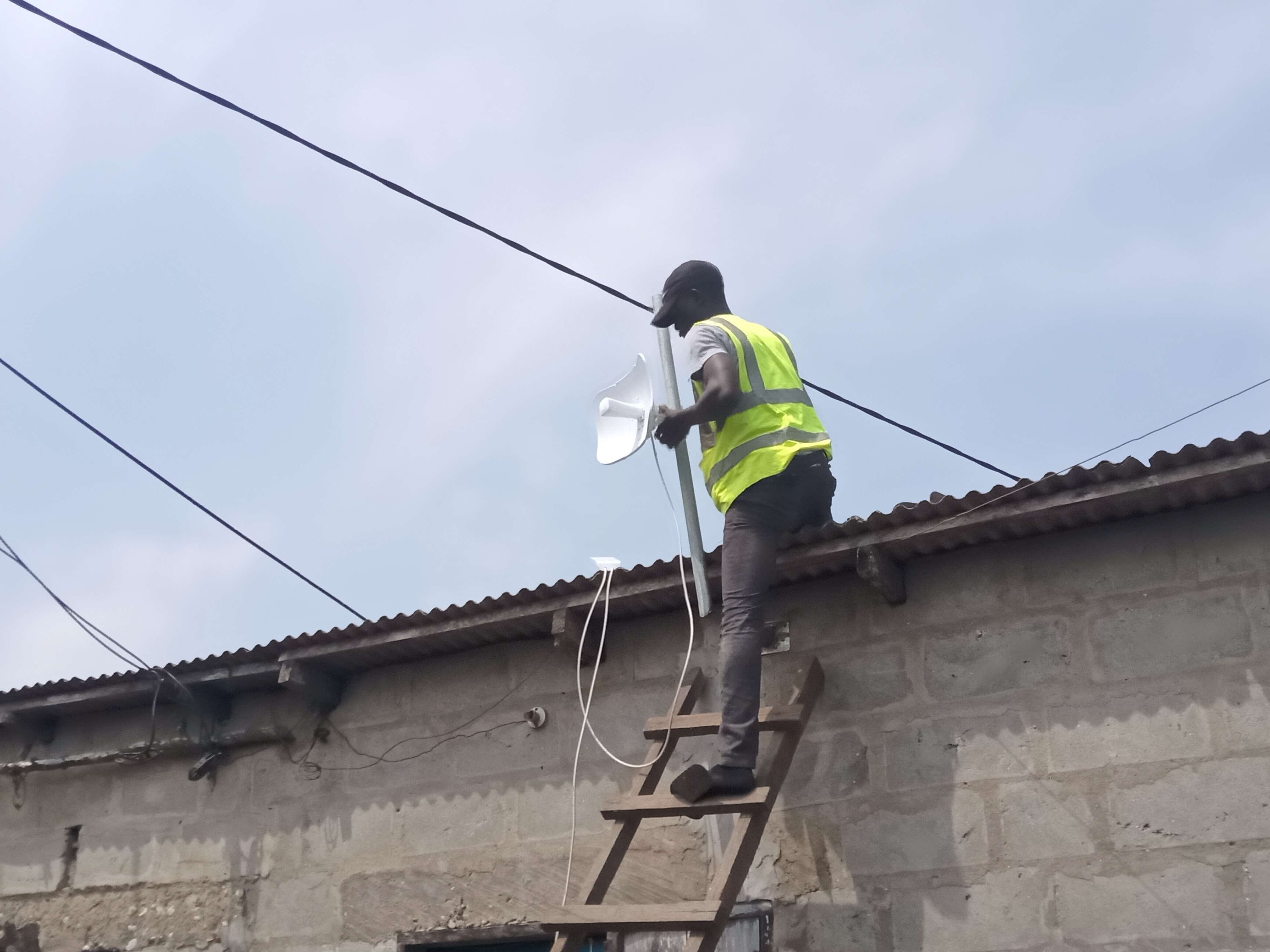 In Hinii Township, we mounted pole with LiteBeam 5AC-Gen2 5GHz configured as Station mode at the Information Center and link directly to the main transmission site through Point-To-Point means. From here an outdoor Cat6 patched cable goes to a passive PoE (Power of Ethernet) LAN port on NanaStation M2. The NanoStation which is also attached to the pole is configured as an Access Point to enable propagate the open wireless signal (internet) to the community or public. An outdoor Cat6 patched cable goes down from the NanoStattion to a PoE (Power of Ethernet) adaptor.